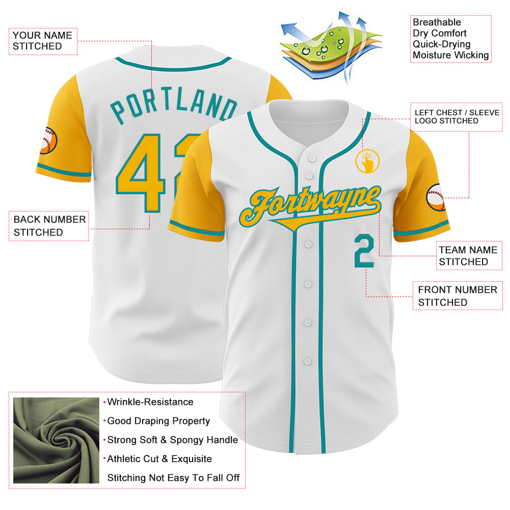 Custom White Gold-Teal Authentic Two Tone Baseball Jersey