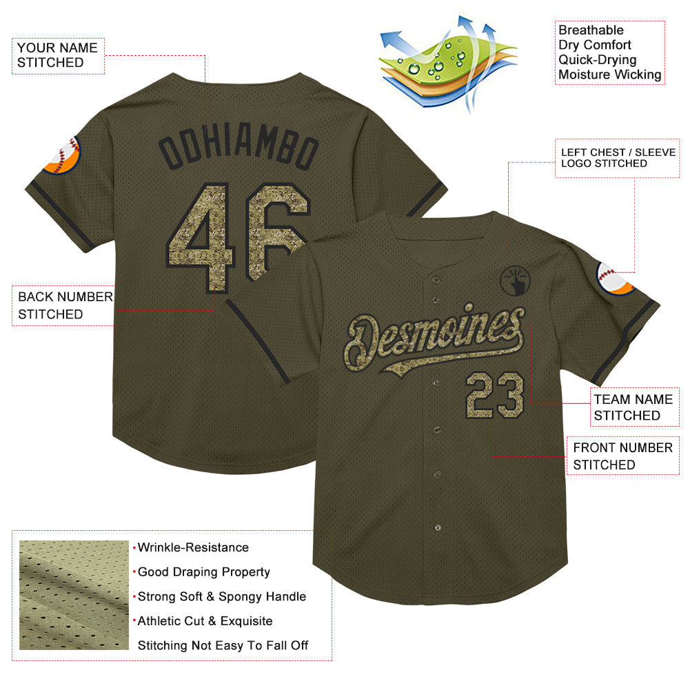 Custom Olive Camo-Black Mesh Authentic Throwback Salute To Service Baseball Jersey
