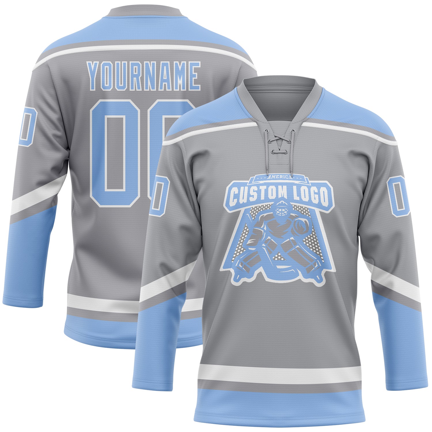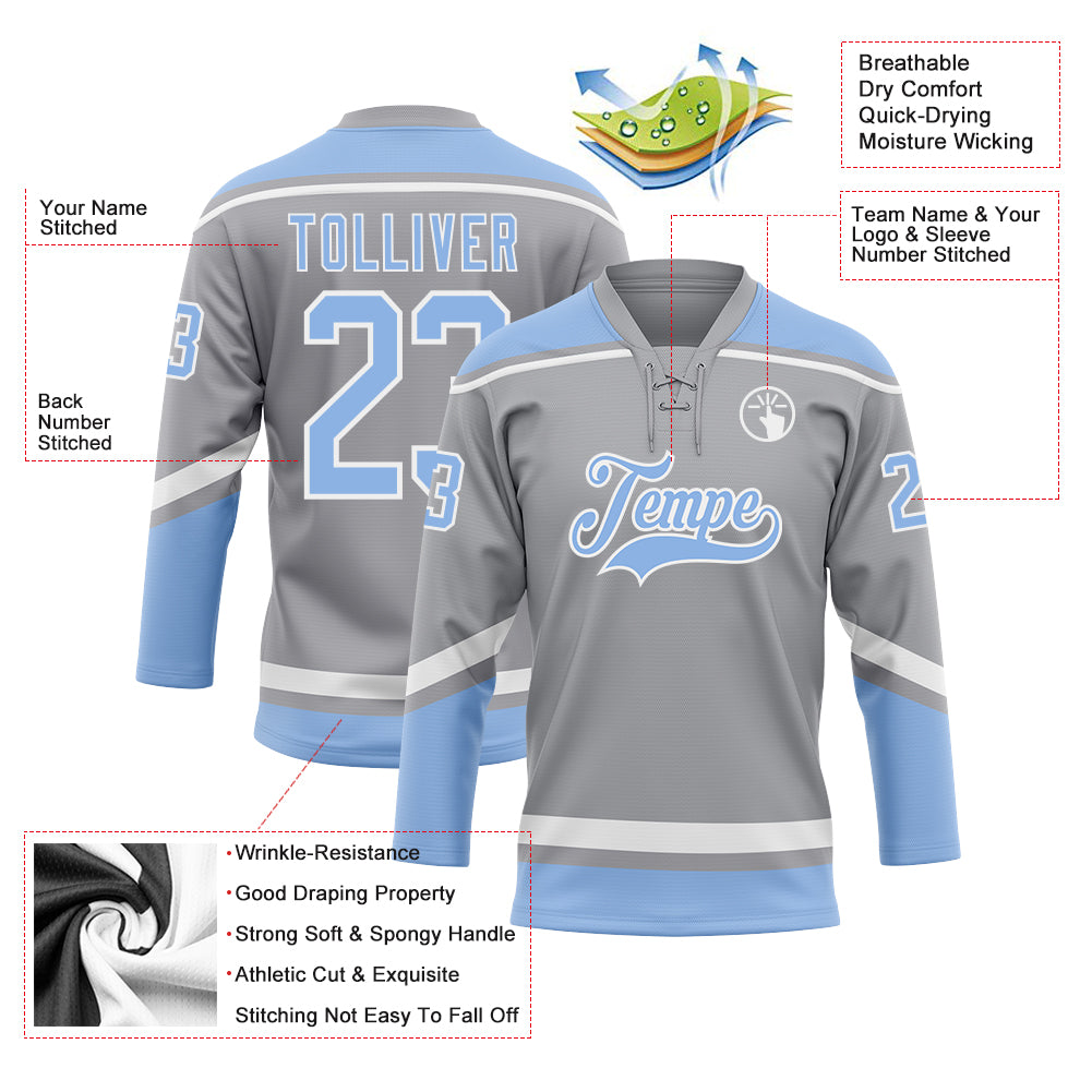 Custom Gray Light Blue-White Hockey Lace Neck Jersey