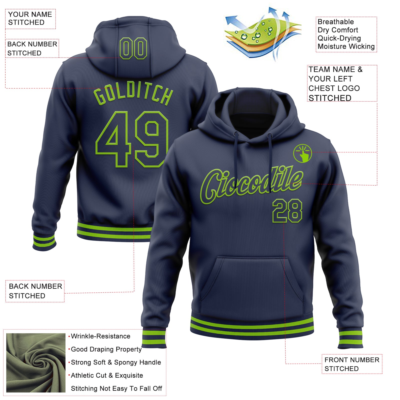 Custom Stitched Navy Neon Green Sports Pullover Sweatshirt Hoodie