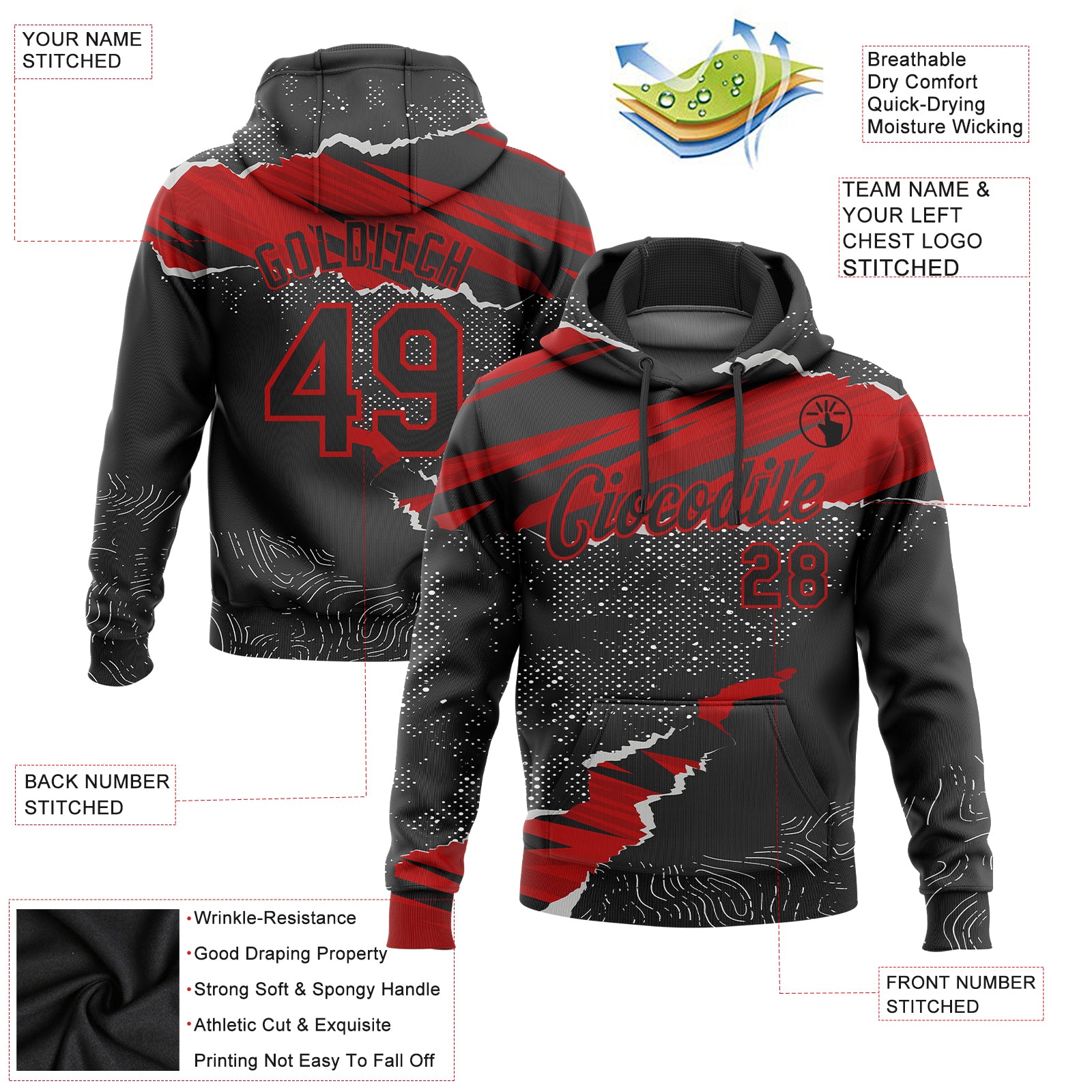 Custom Stitched Black Red 3D Pattern Design Torn Paper Style Sports Pullover Sweatshirt Hoodie