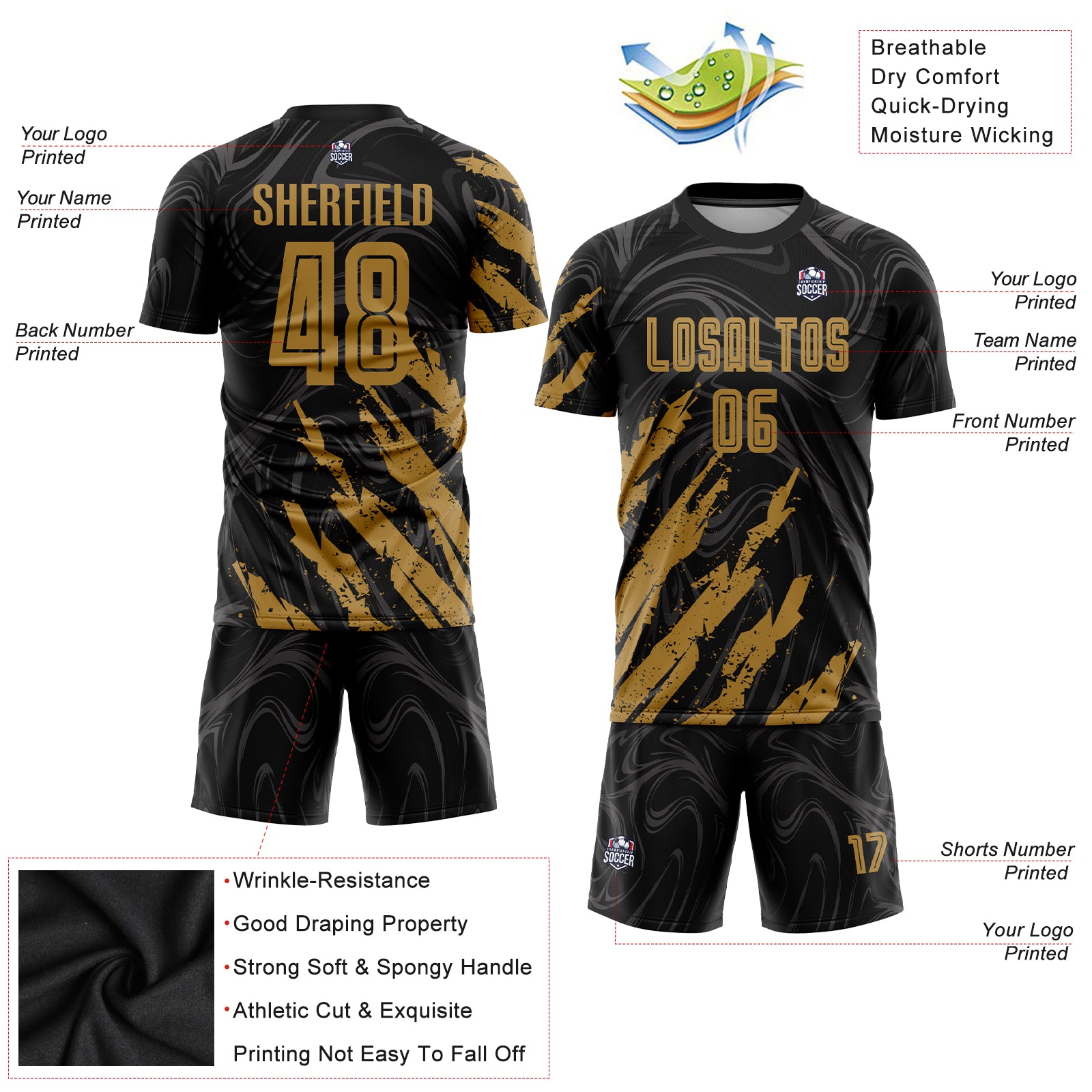 Custom Black Old Gold Sublimation Soccer Uniform Jersey