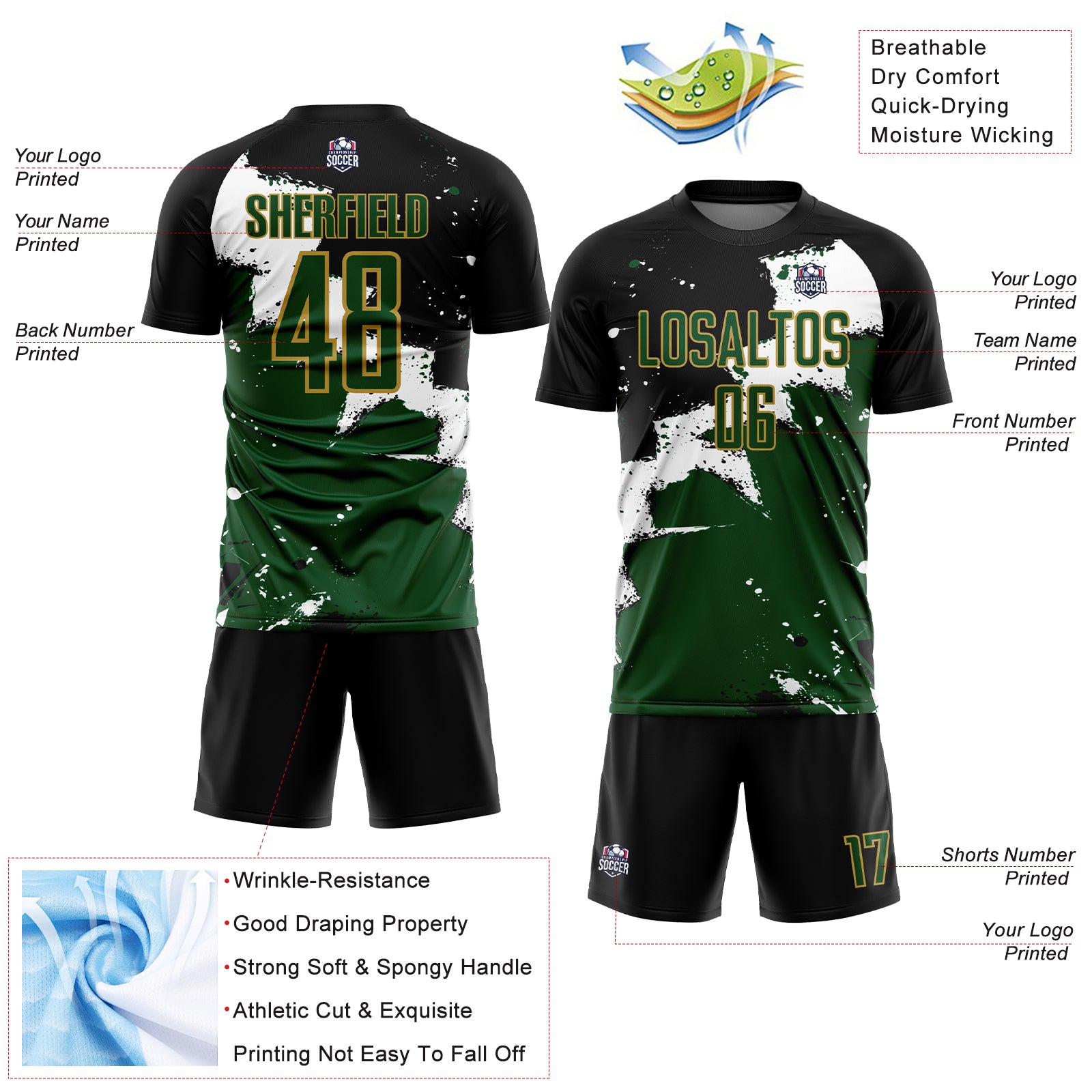 Custom Black Green-Old Gold Spalsh Sublimation Soccer Uniform Jersey