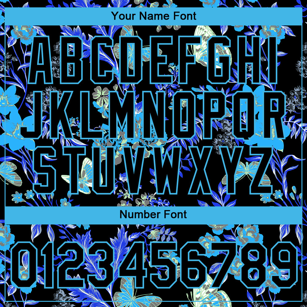 Custom Black Sky Blue 3D Pattern Design Flower With Butterfly Performance T-Shirt